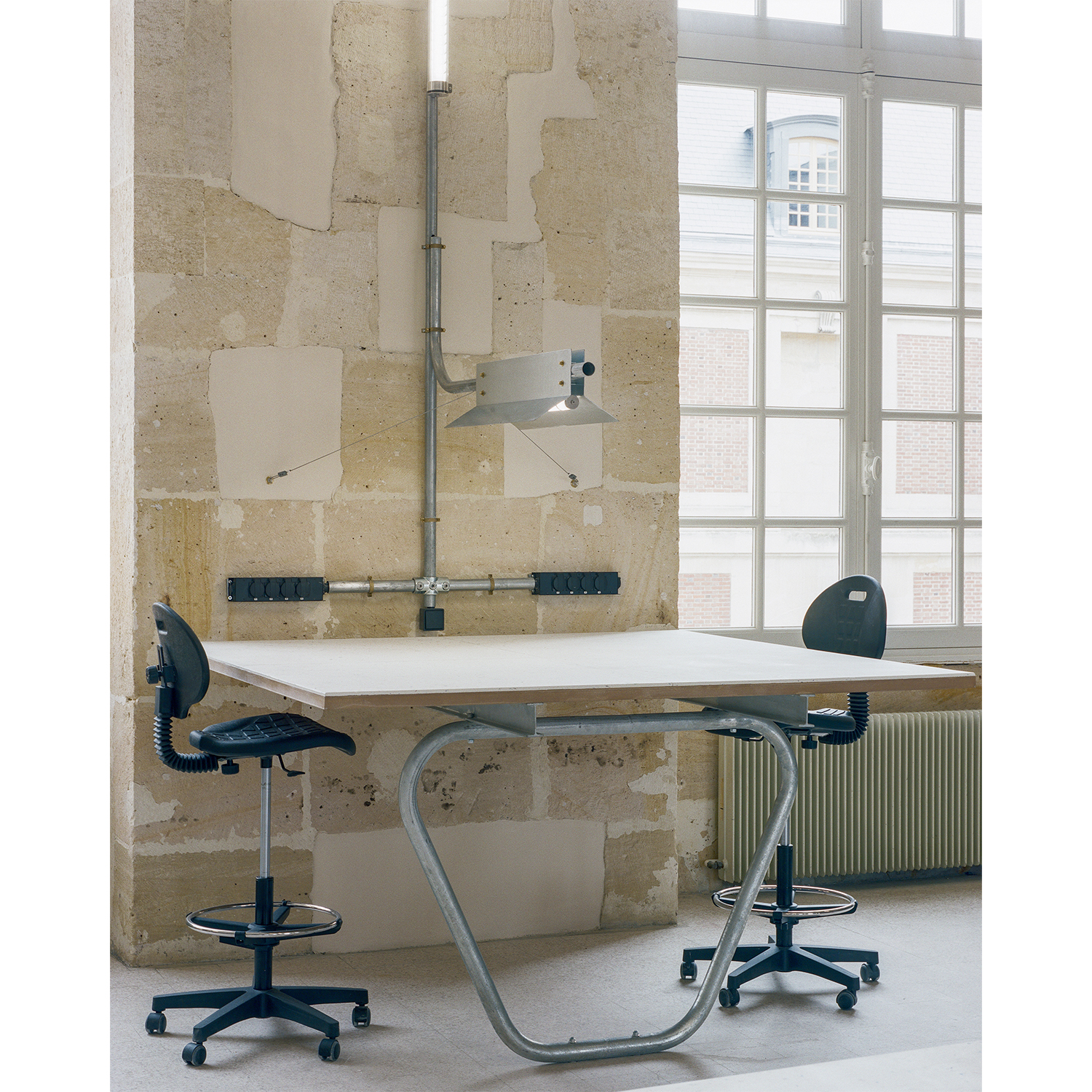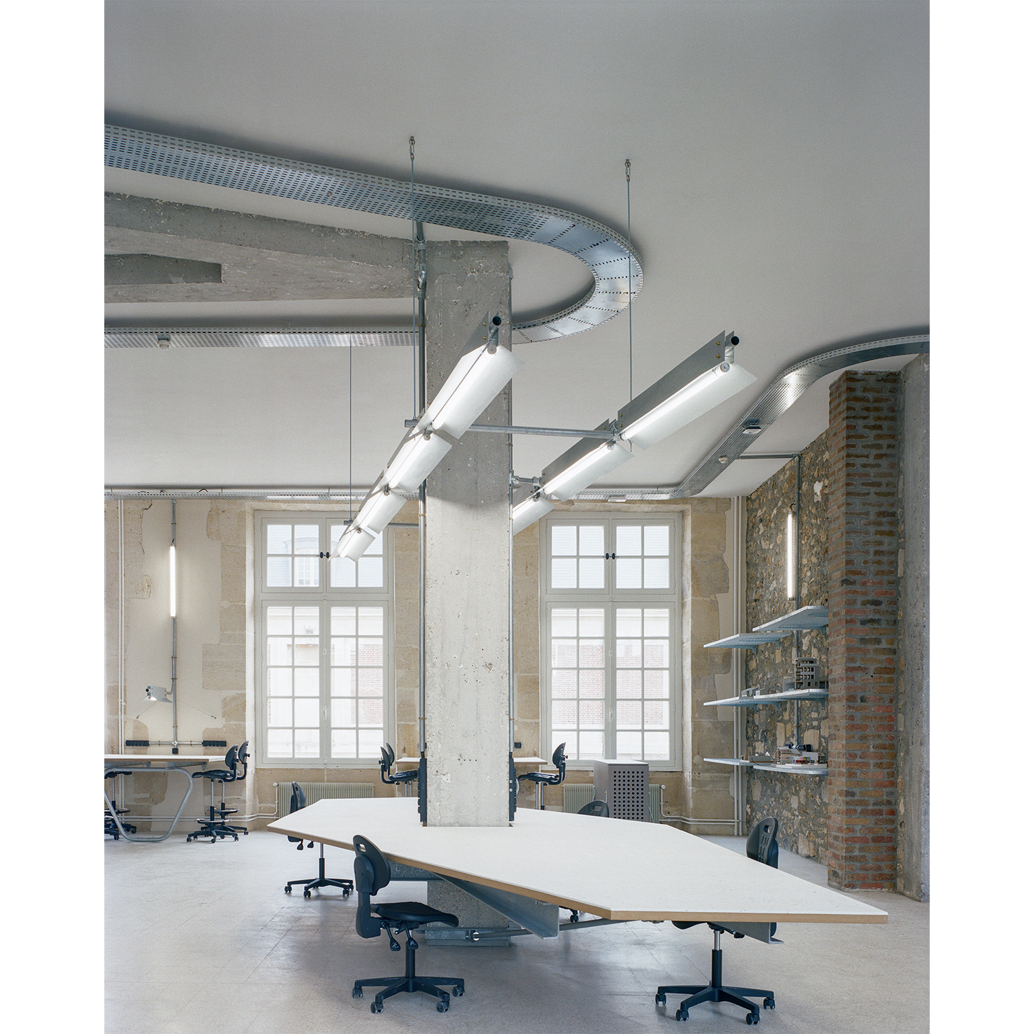 Le mobilier est conçu sur mesure, par l’assemblage mécanique d’éléments standardisés, présentant le minimum de transformations. Les systèmes de fixation à l’existant sont pensés pour libérer et dégager efficacement les espaces, souvent encombrés lors des rendus de projet. Les matériaux bruts, comme l’acier galvanisé et le plastique recyclé, sont utilisés pour résonner avec l’histoire du lieu. La restauration des pierres et des enduits, datant de plus de 300 ans, crée un dialogue entre l’architecture historique et la nouvelle intervention.