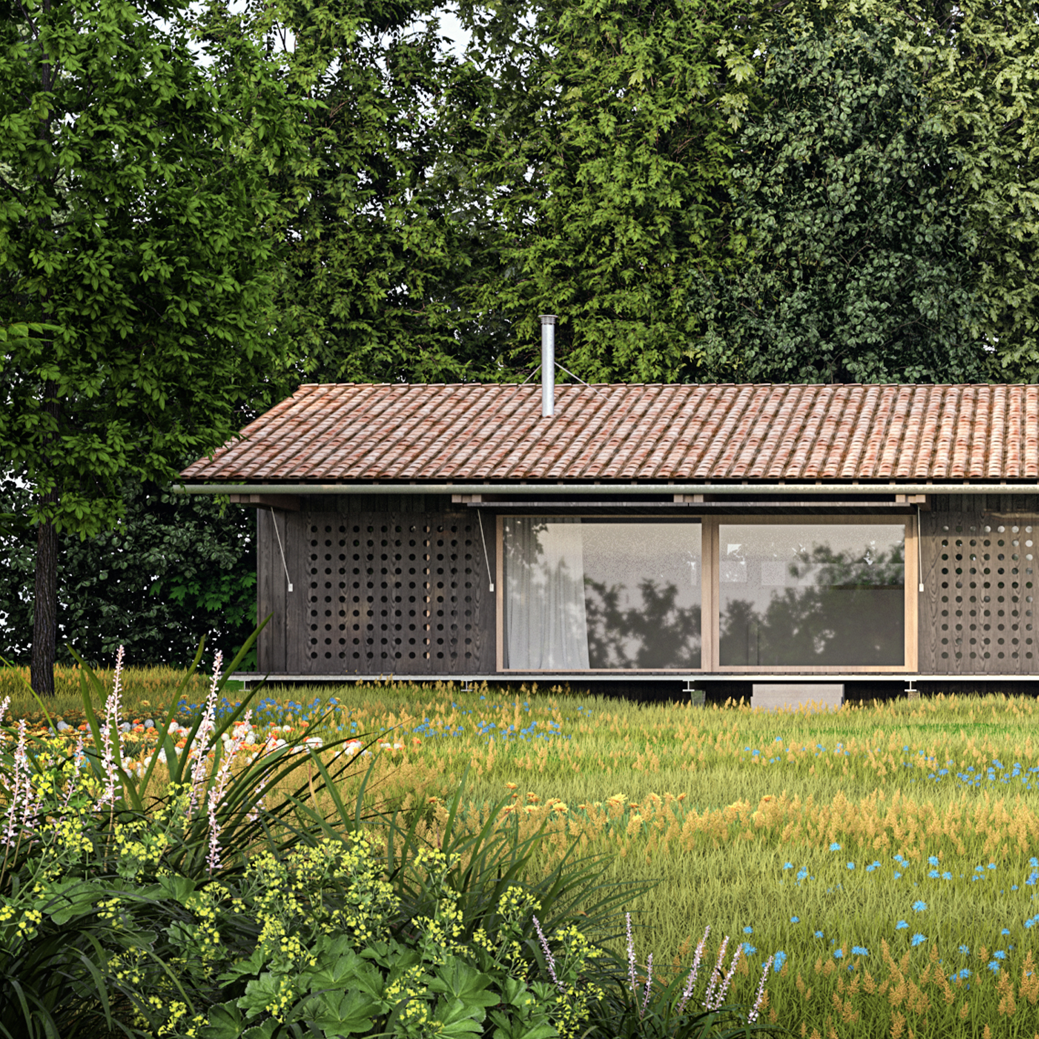 La forme de fine longère facilite un renouvellement d'air constant tandis que l'important débord de toit vient apporter une protection solaire en été. Ces deux systèmes permettent de réguler simplement les apports énergétiques nécessaires selon les saisons. Le prolongement extérieur de charpente devient également support du mécanisme de fermeture de la maison, constitué de larges panneaux de bois perforés manipulables grâce à un jeu de poulies et de treuils mécaniques fixés à l'intérieur de la maison sur chaque poteau bois.